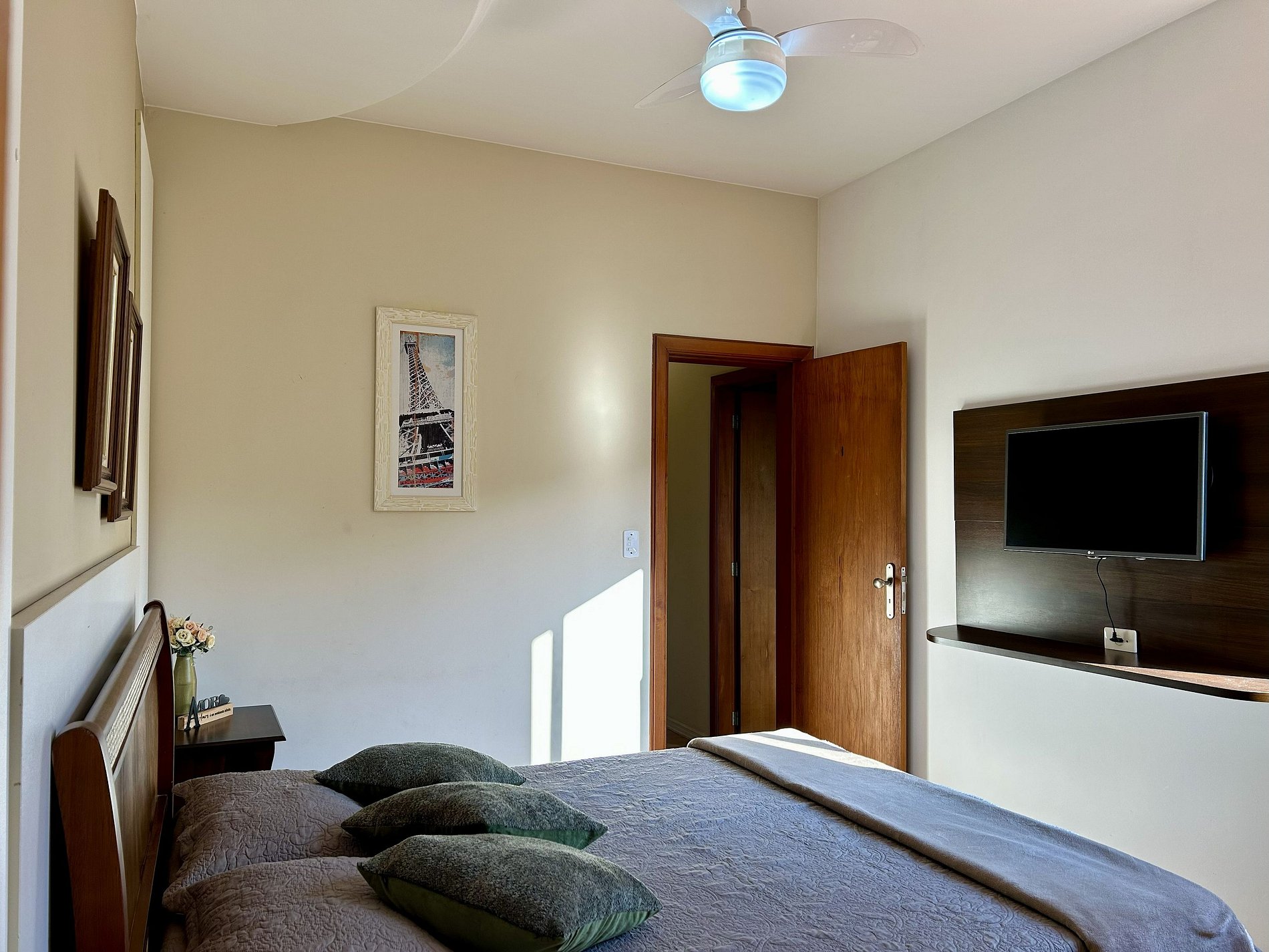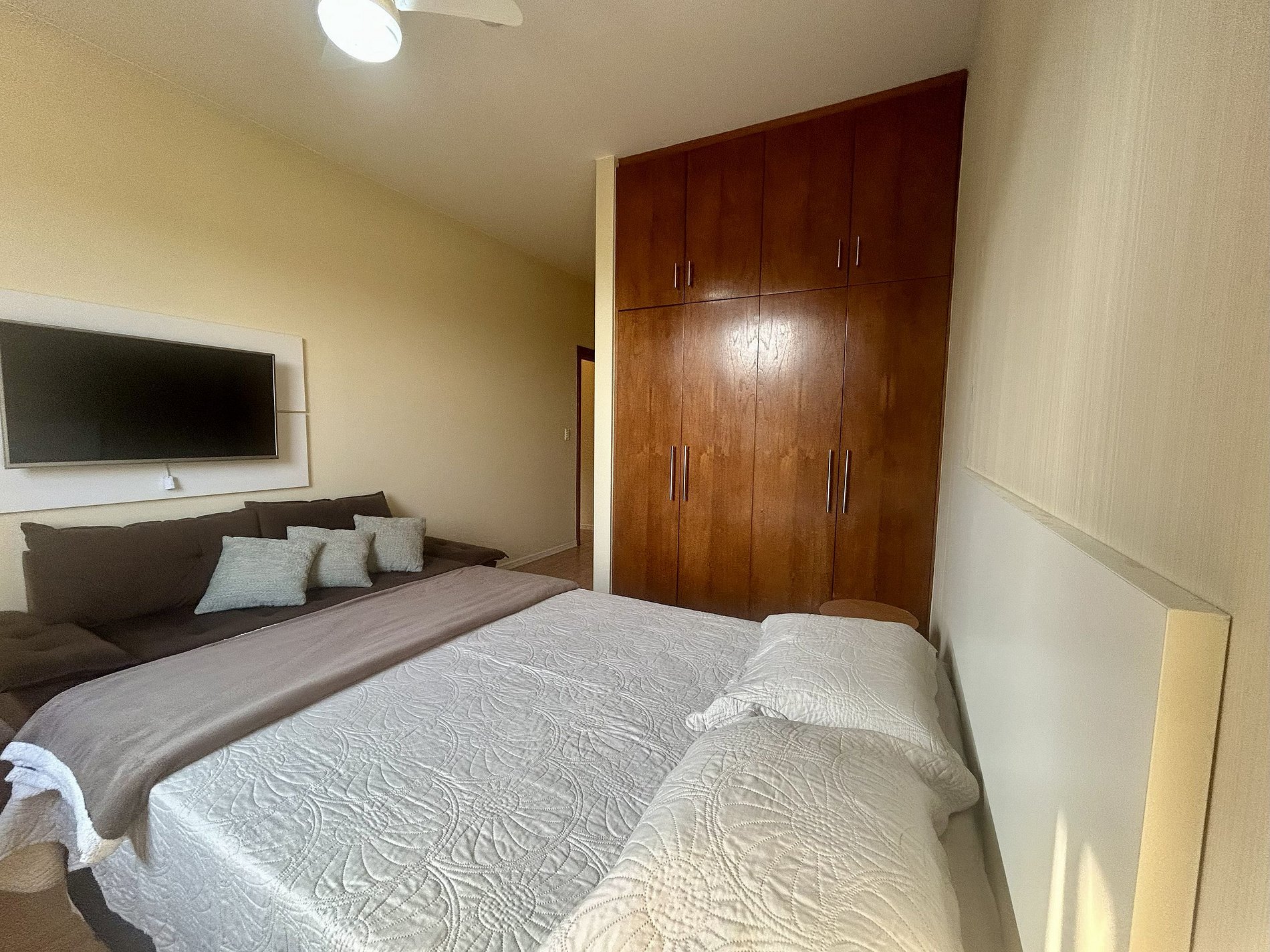 * Cama de casal padrão * Ventilador de teto * Smart TV * Guarda roupa * Banheiro completo