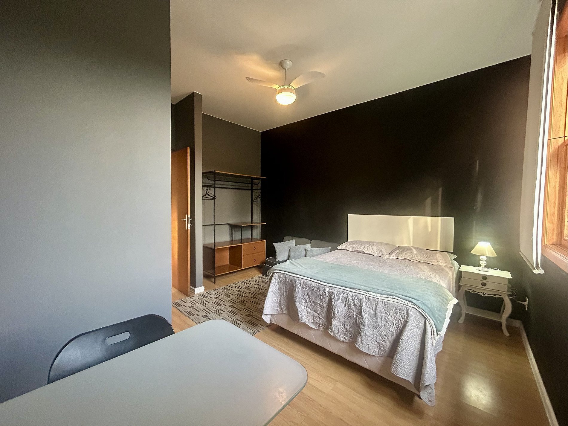 * Cama de casal padrão * Ventilador portátil * Sofá cama casal tipo futton* Armário com escrivaninha