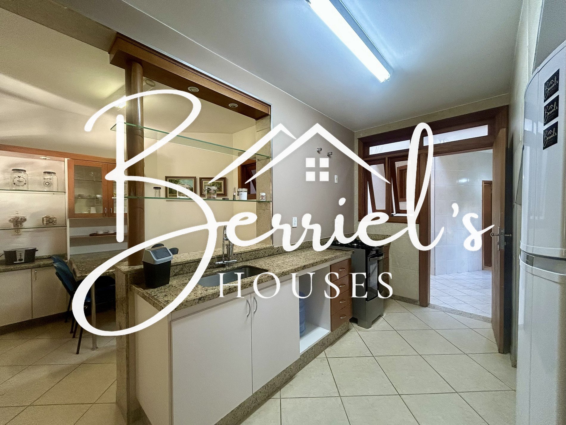 * Geladeira * Fogão 4 bocas com forno * Microondas * Cafeteira elétrica comum * Liquidificador * Torradeira * Sanduicheira * Utensílios diversos para preparar e servir refeições. *Mesa para 4 pessoas