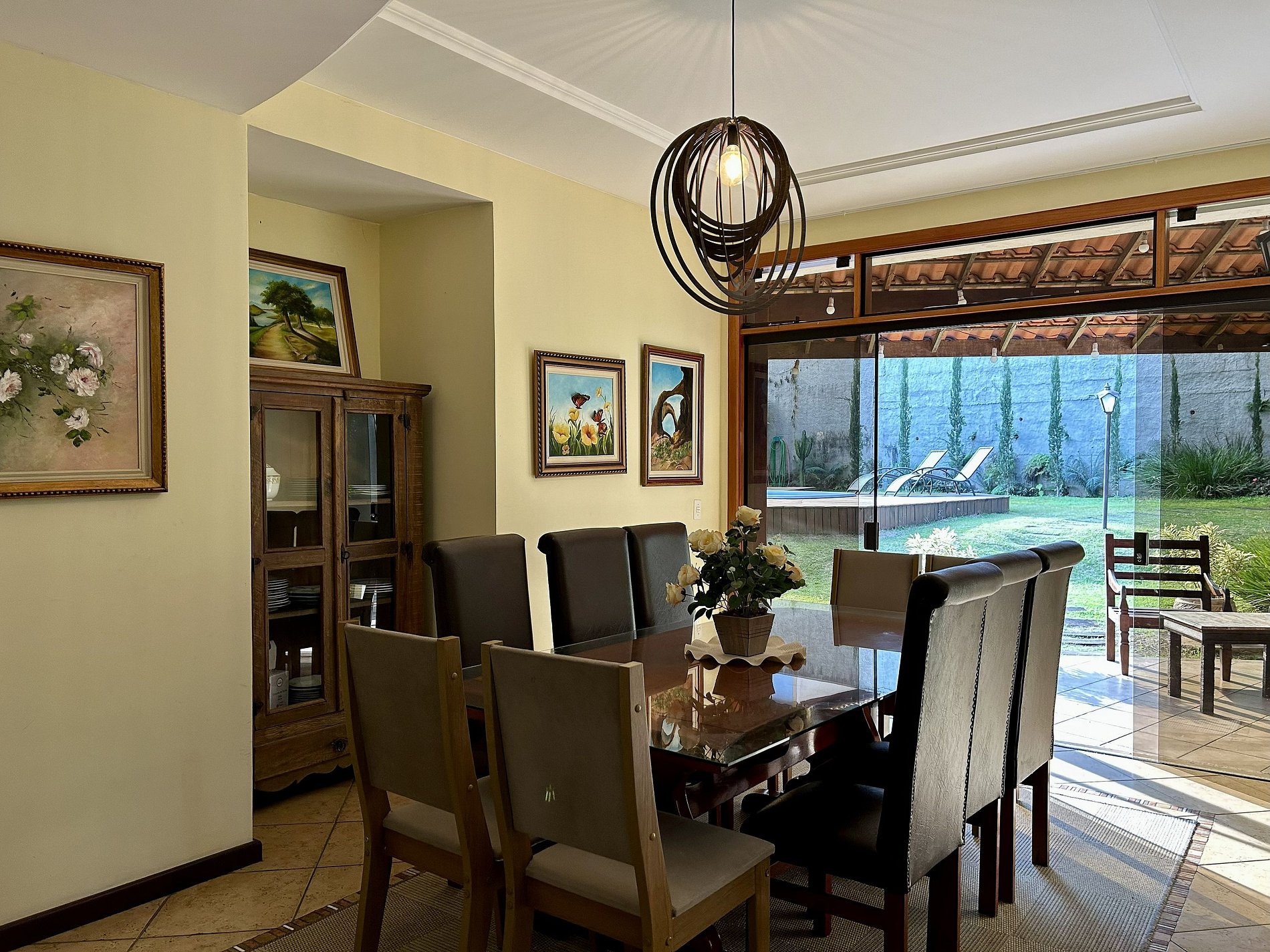 * Mesa de jantar com 8 lugares * Cristaleira estilo rústico com aparelho de jantar.