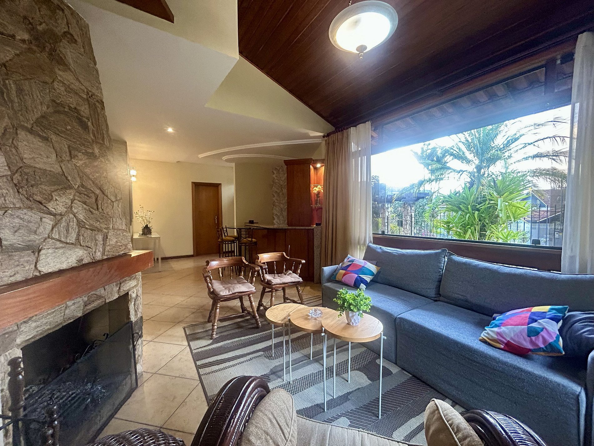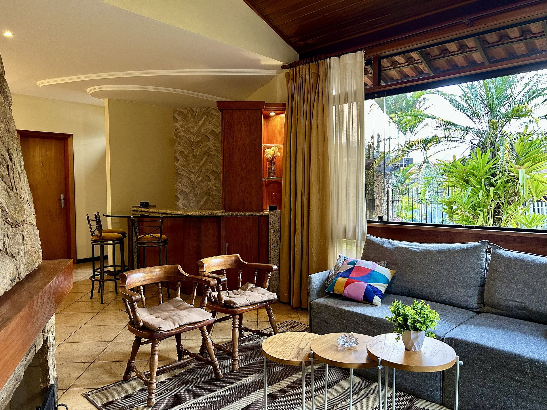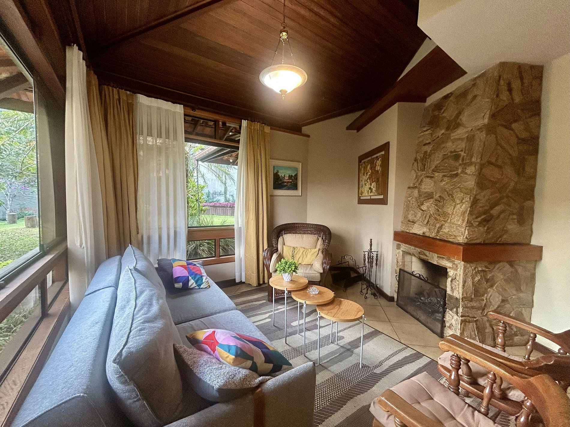 * Cadeiras 2 * Poltrona 1 * Sofá Cama 1* Conjunto de 3 mesas de centro * Lareira (Não fornecemos lenha, item por conta do hóspede) * Bar com balcão e mesa de vidro * 3 banquetas bistrô.