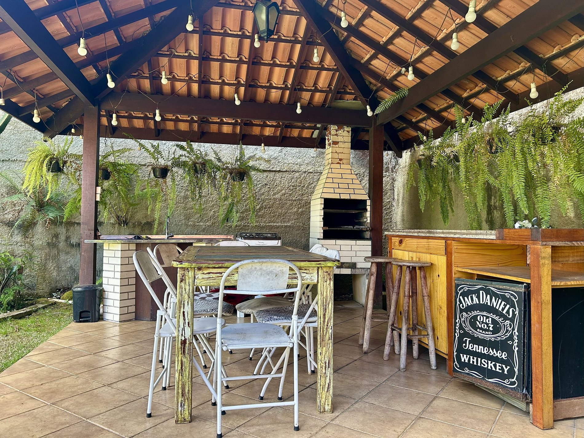 * Pia e bancada para churrasco * Mesa com 6 cadeiras * Churrasqueira à carvão ( Não fornecemos carvão, item por conta do hóspede) * Frigobar * Fogão 4 bocas